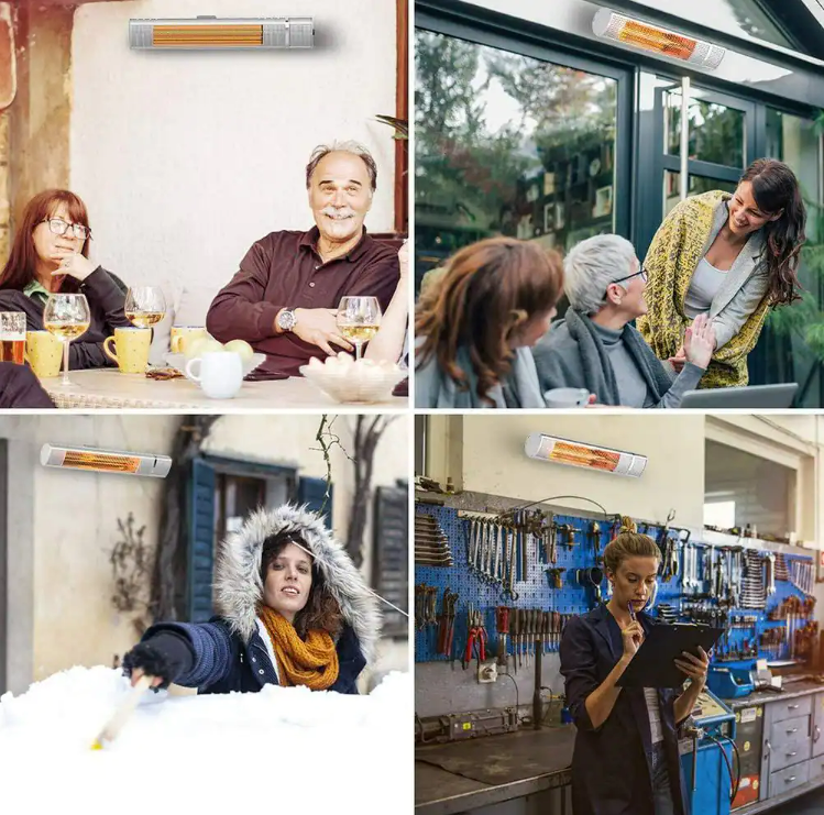 PATIO BOSS Wall Mounted Electric Outdoor Heater with remote control, suitable for multi application scenarios, advanced gold tube infrared heating technology heat up fast in-seconds, a most healthy way to warm up in cold winter. Rust protection aluminum alloy shell and IP65 rated dustproof and water-resistant protection is best solution for outdoor use. 3 heating mode 500-Watt/1000-Watt/1500-Watt adjustable for different needs, which is energy efficient. Radiating quietly while you are working, reading and resting. Far infrared ray is helpful to improve the blood circulation to relieve the fatigue. Safe Overheat Protection will auto shut off when temperature reach over safe level. Wall mounting the infrared heater in porch, courtyard, enjoy your cigar and tea in patio with comfort during winter-days.