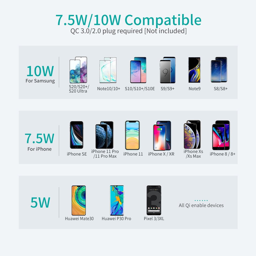 - Compatible with Qi Certified smartphones. With 5W, 7.5W, 10W, three charging modes.