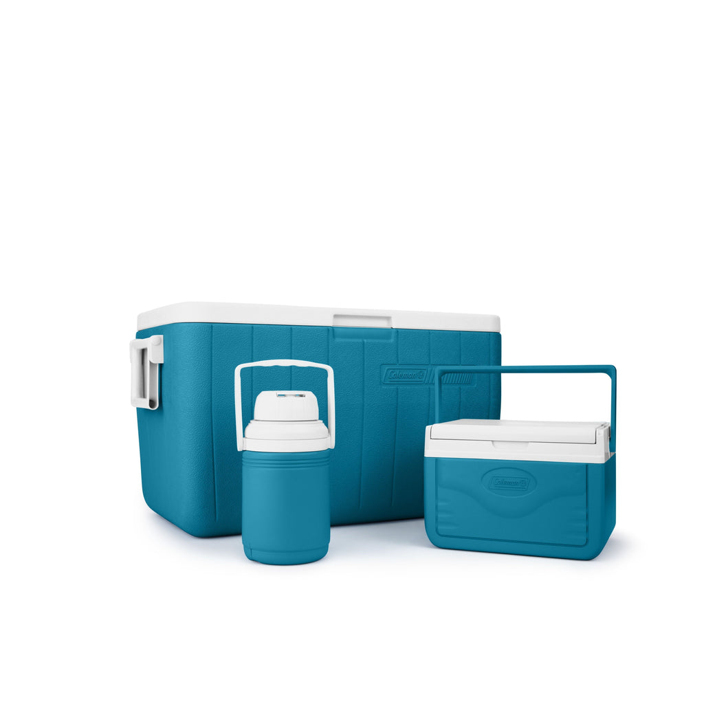 Meet the Chiller™ Series Coolers designed to be easy to take with you on every adventure. Make the most of all of your outdoor adventures with the Coleman Chiller 48QT, 5QT, and 1/3 Gallon Jug Cooler Bundle. Whether you’re bringing lunch to work, tailgating with friends, or camping with the family, these coolers keep drinks cold for whatever the day or weekend brings. Plus, we made the 48QT coolers taller so you can fit 2 liter bottles upright without worrying about spills. When it’s time to head home, the 2-way handles swing up for easy lifting, and the EZ-Clean™ top’s smooth surface makes cleaning up a breeze.