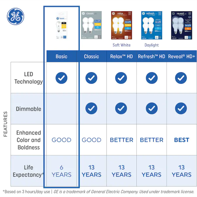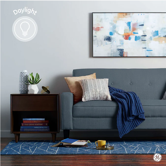 GE Basic Daylight LED 60-Watt Replacement light bulbs provide a long-lasting, energy-efficient alternative to incandescent and halogen light bulbs. These are great for fixtures that are frequently left on GE Basic Daylight LED bulbs are rated to last over six years and save 42 dollars in energy costs over the bulb's life versus a 60-Watt incandescent bulb. They illuminate your home with cool, bluish-white daylight light. Compared to CFL light bulbs, these GE LED bulbs feature instant full brightness, traditional incandescent shape and are free of Mercury. Replace CFL and incandescent light bulbs with GE Basic Daylight LED general purpose light bulbs in non-dimmable indoor table lamps, sconces and open fixtures, including damp locations.