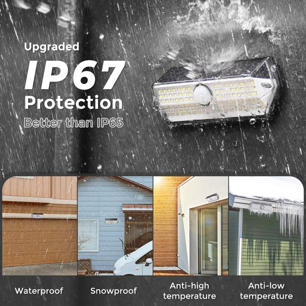 - Accurate PIR Solar Motion Light: Built-in a sensitive light sensor and PIR motion sensor (sensing distance up to 26.4FT/8M and 120°sensing angle), the solar motion sensor Light can pick up movement from a small dog/cat easily, but will not be triggered by raindrops, leaves, etc. After detection, the solar security lights will light up a large scale of space with gradual illumination and will not scare your pets or guests
