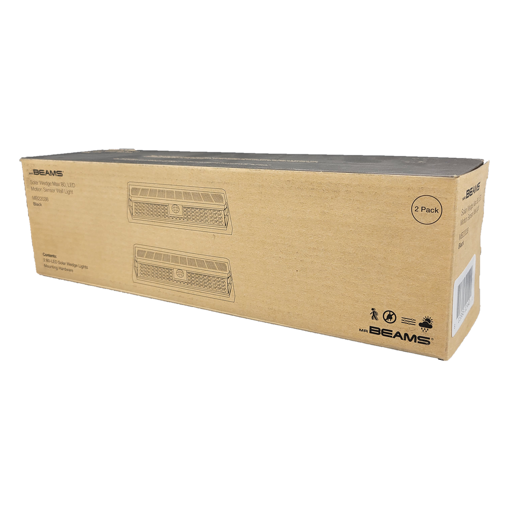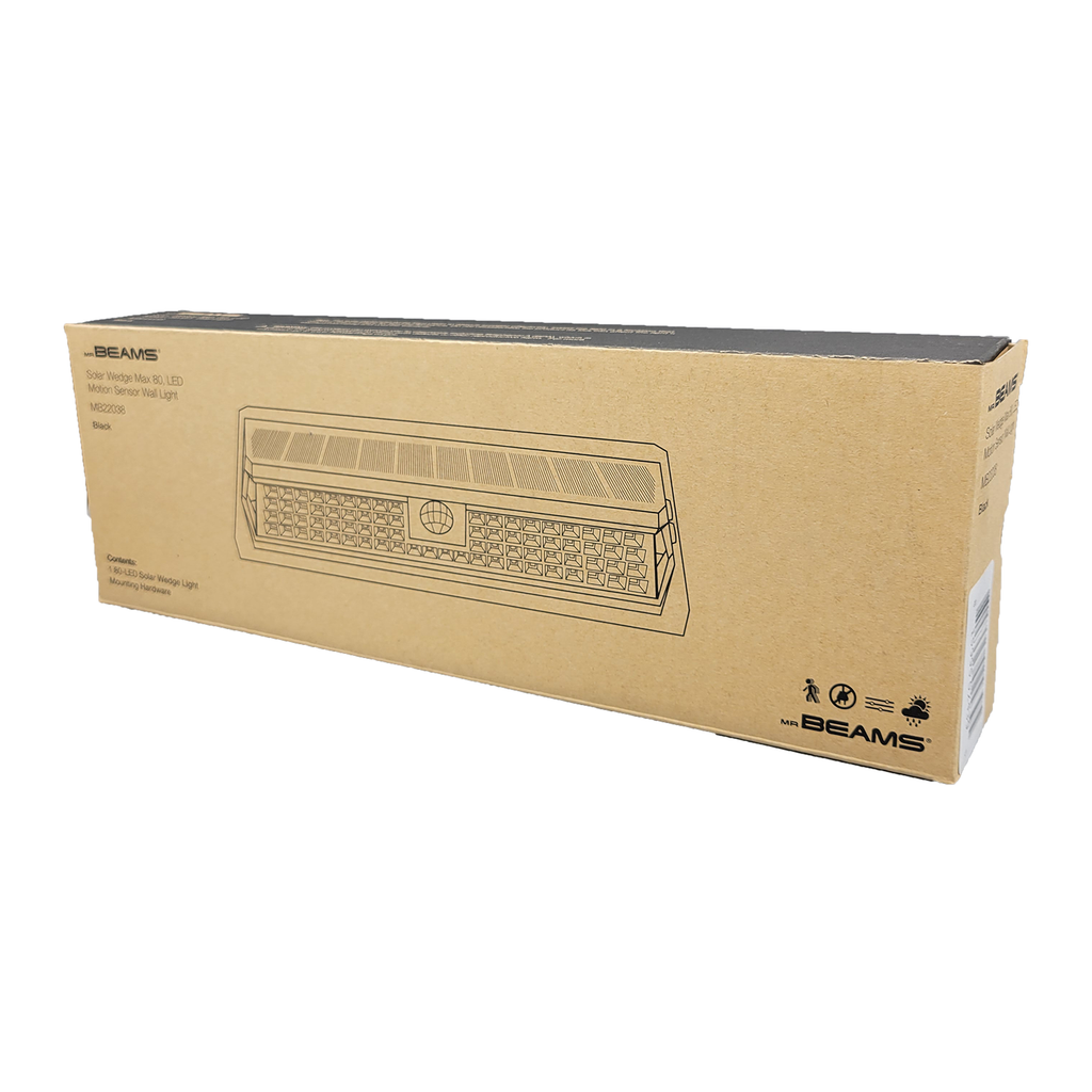 The solar wedge max 80, LED motion sensor wall light combines the reliability of Mr Beams’ home security lighting with the convenience of solar power. Instantly increase home safety and security in areas like garages, doorways, sheds and backyards with bright, motion-activated lighting. The security light’s rechargeable solar panel provides an energy-efficient home lighting solution. The panel has a nominal capacity of 1800mAh and reaches its fullest charge in 5-6 hours of direct sunlight. A full charge can provide 27 days of light on the motion activated mode with average use of 8 activations a night. Choose from 3 lighting modes based on different lighting needs. GlowMode provides a continuous 5-lumen dusk-to-dawn glow, then activates to full brightness with motion. Dusk-to-dawn mode provides 145 lumens of continuous light regardless of motion. Motion activated mode activates to 445 lumens, which is full brightness, only when it detects motion. Mr Beams solar wedge max 80, LED motion sensor wall light installs in 5 minutes with the included mounting hardware. Simply determine the mounting location, hold the light in place and drill the screws through the holes at the top of the light. We recommend installing on a wall surface that receives direct sunlight. Anchors are included for drywall installation.