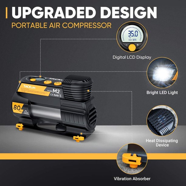 - Power Required: Only support 12V-DC cigarette lighter socket plug. This TACKLIFE portable air compressor offers a working voltage of 12 volts DC, maximum amperage of 10 amps, and maximum working pressure of 80 PSI.